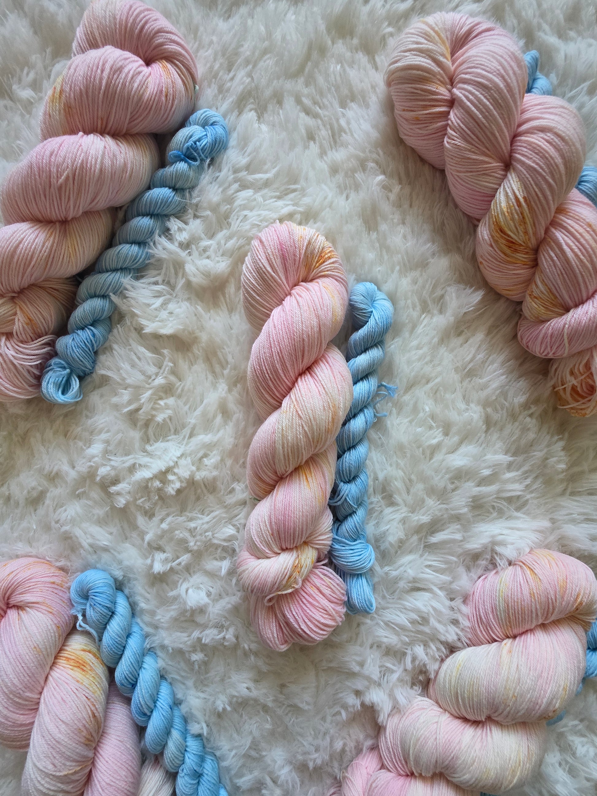 Embrace soft romance with every stitch. This gentle sock kit brings springtime meadows to your needles—delicate blush pinks, periwinkle blues, and soft lavender tones inspired by wildflower fields.