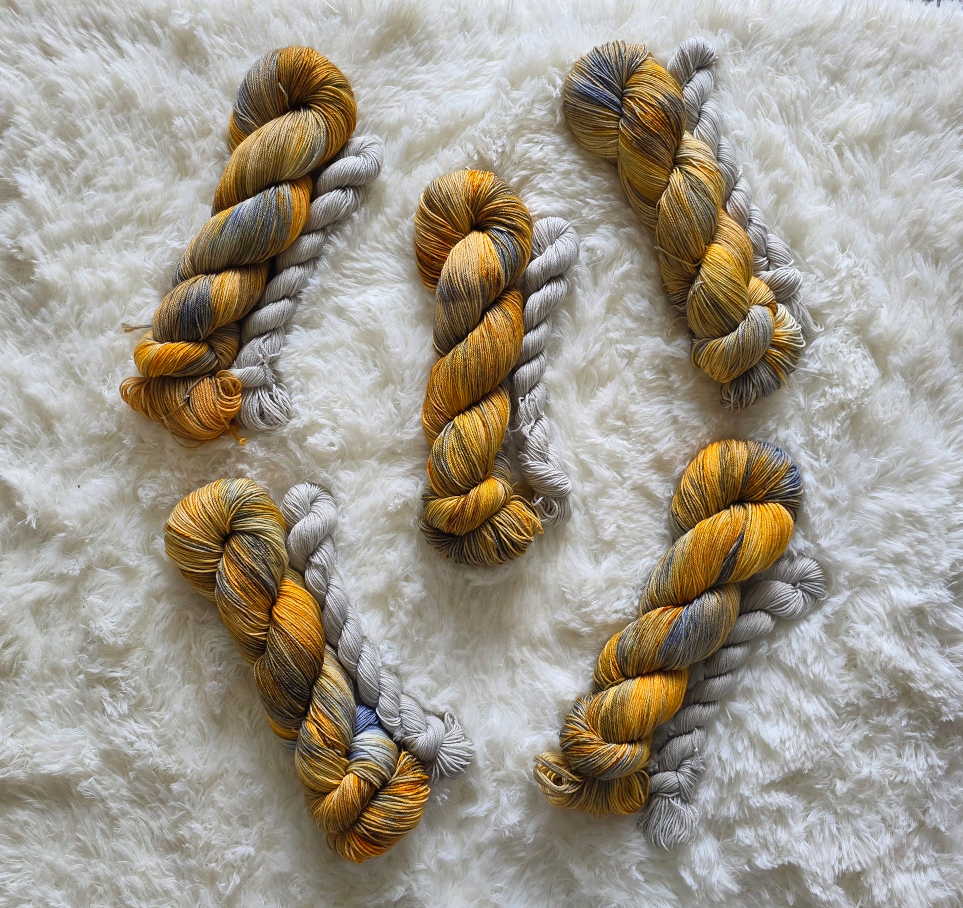 Gather 'round the glow with every stitch. This cozy sock kit captures the warmth of late-night fires—deep navy and charcoal grays, flickering orange embers, and smoky tones inspired by starlit gatherings.