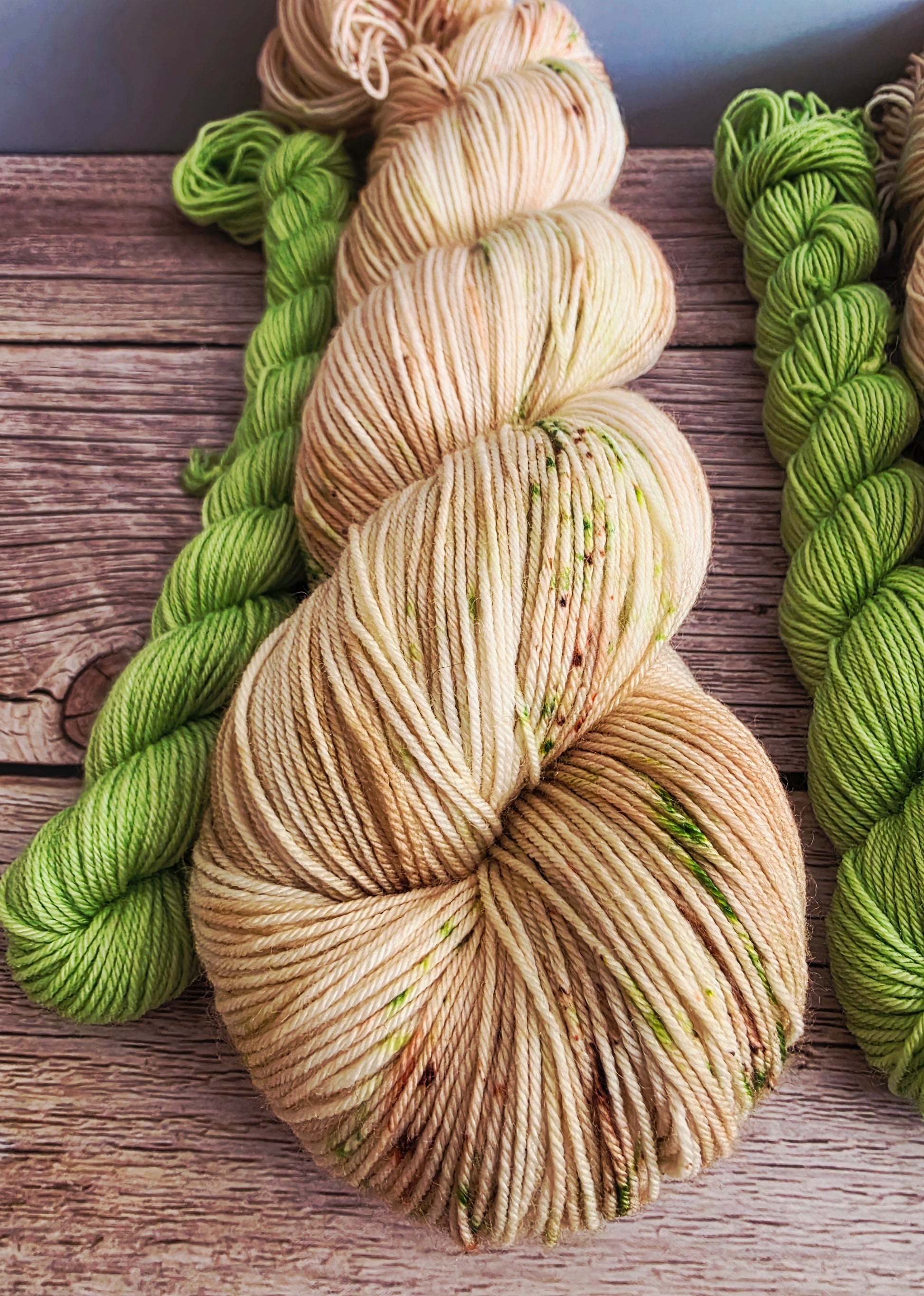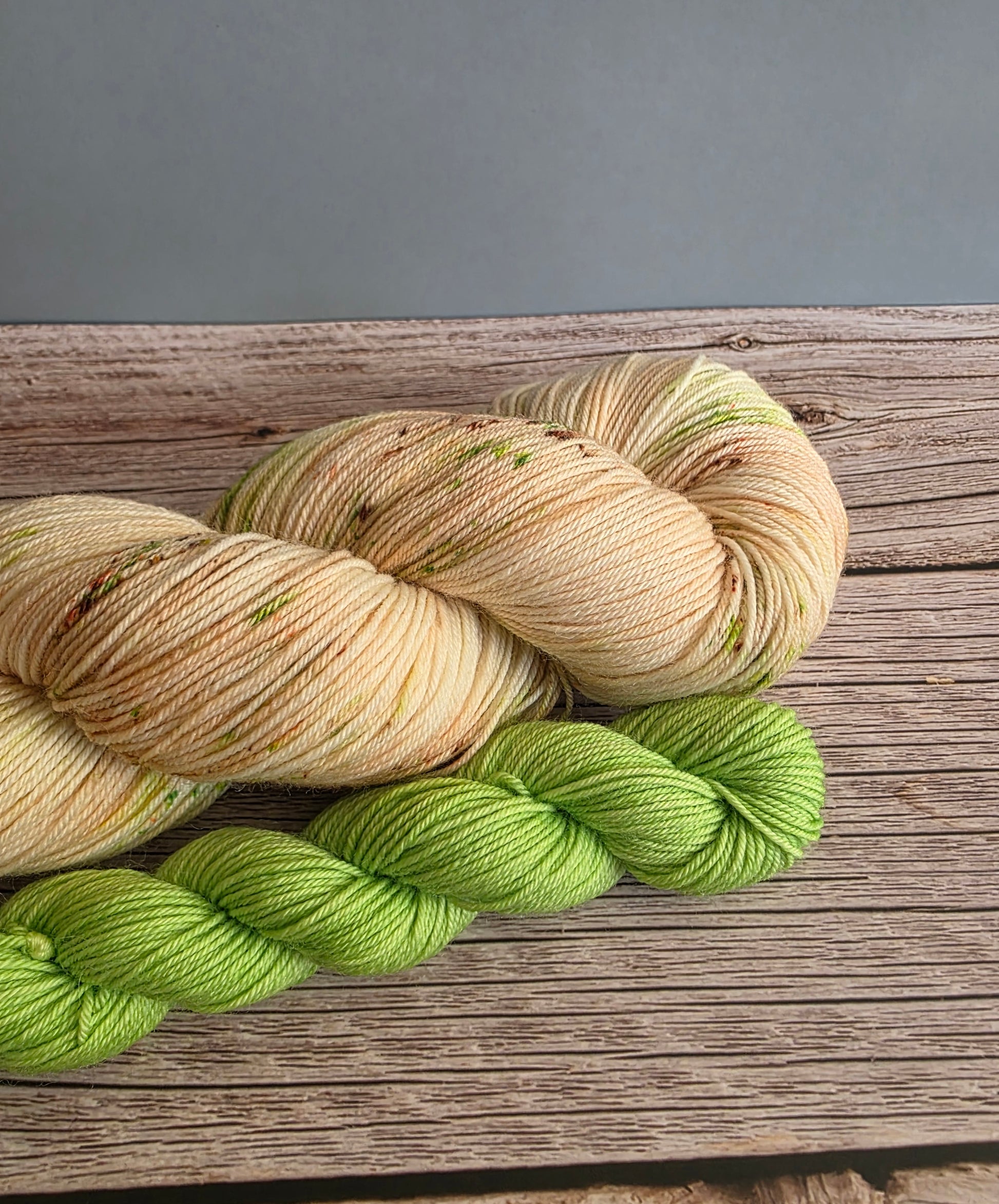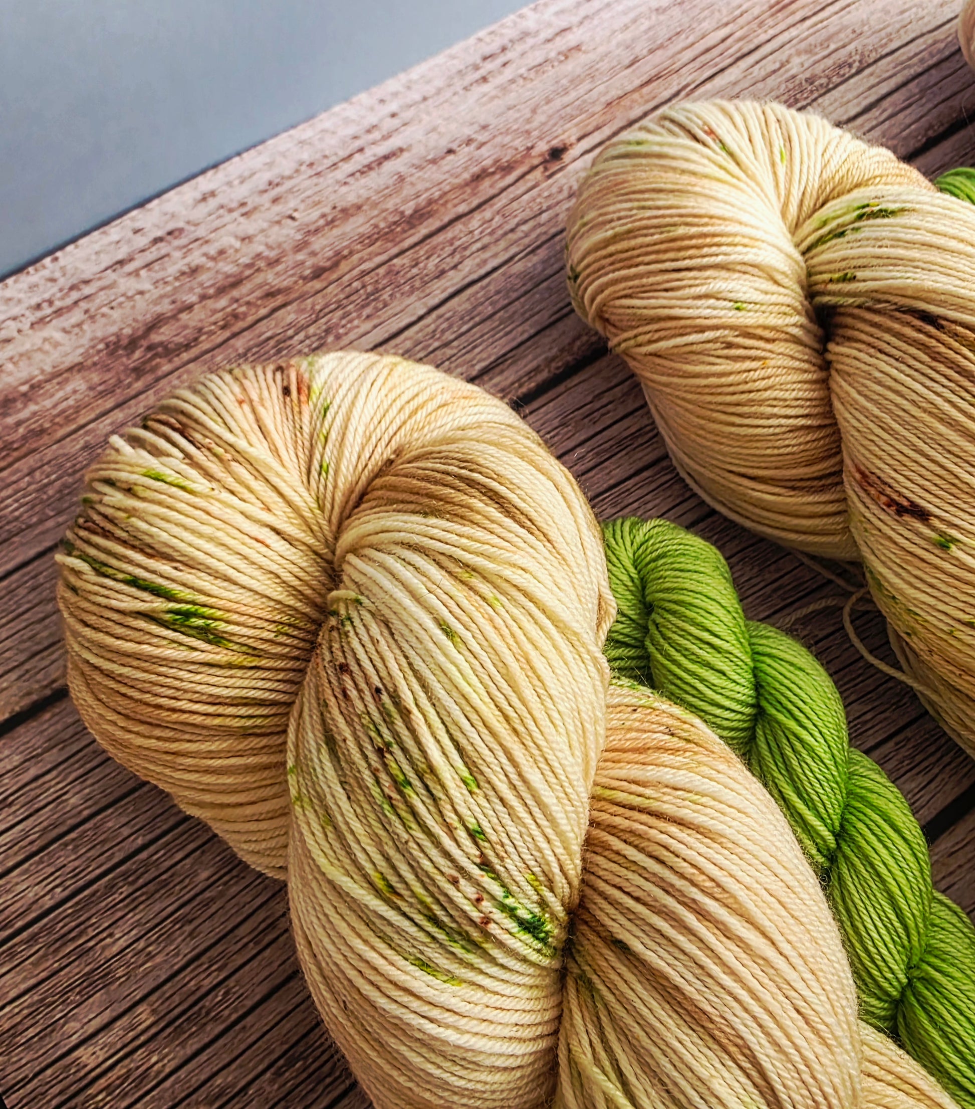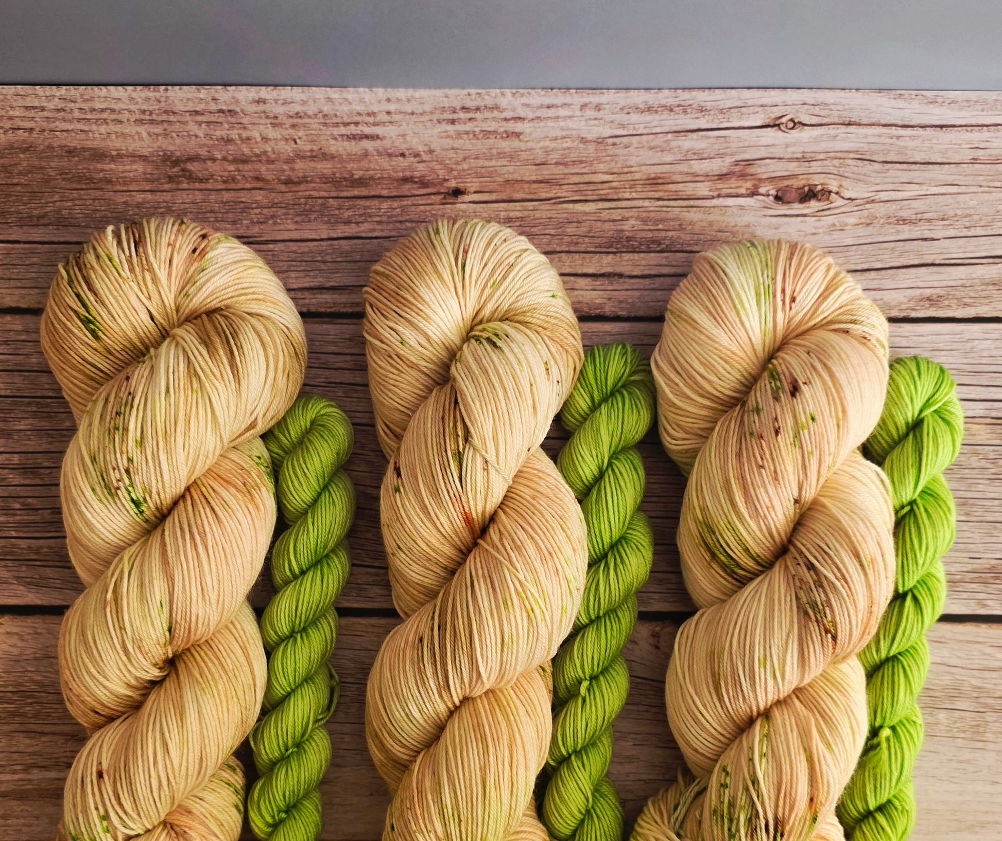 The main skein features various shades of soft tan with specks of brown and matcha green with a mini skein of matcha green.