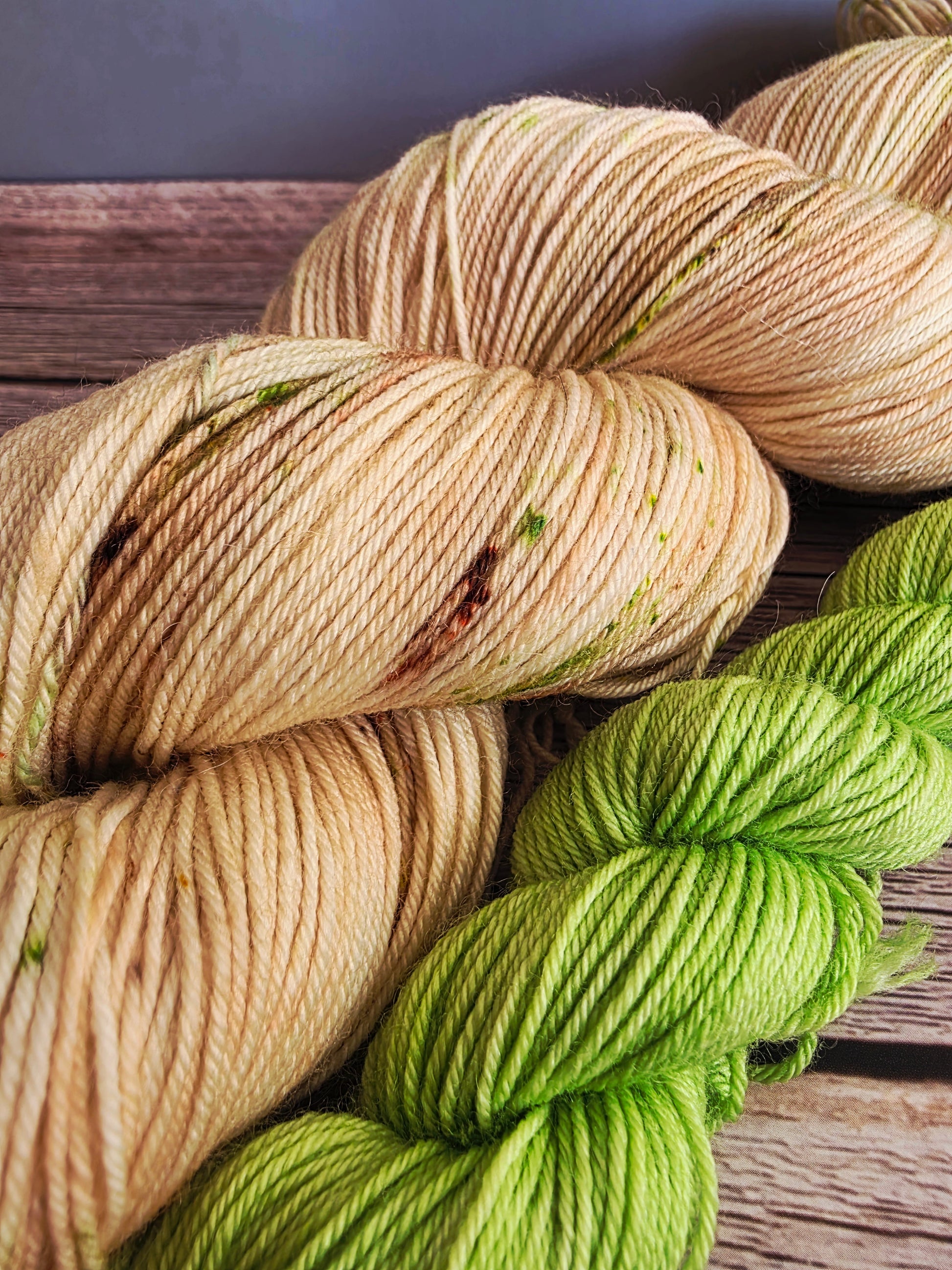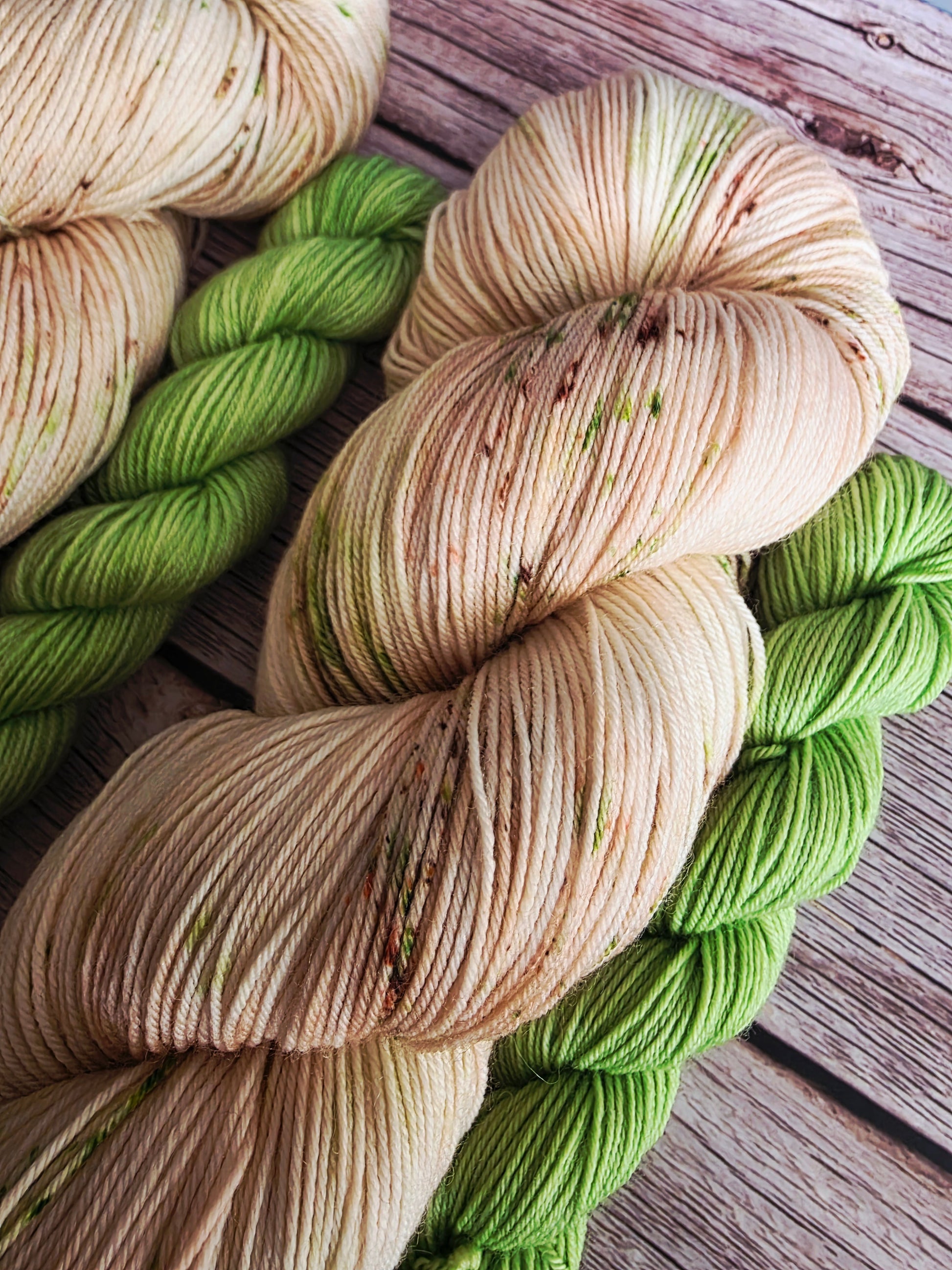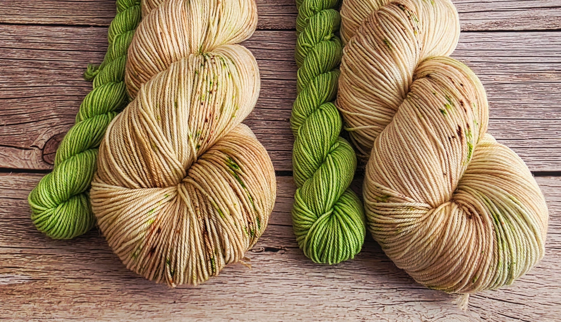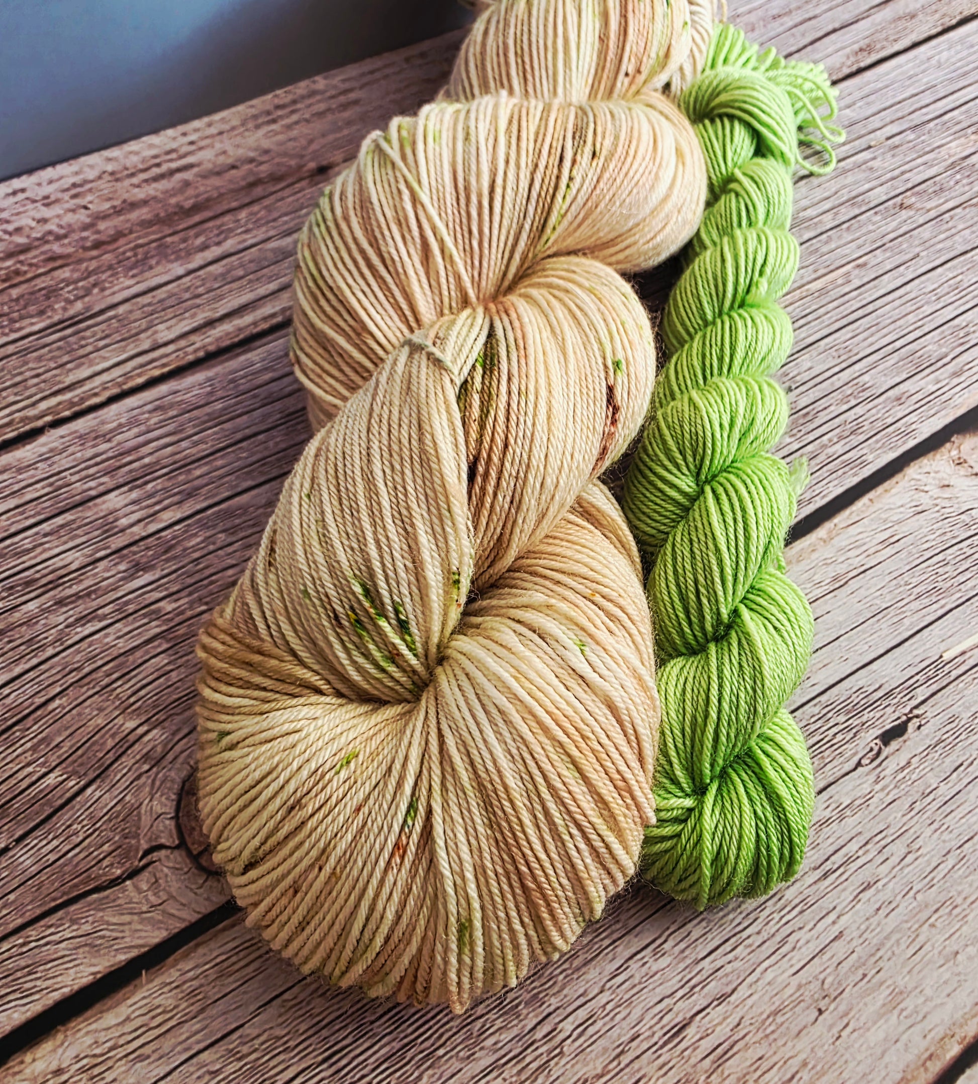 The main skein features various shades of soft tan with specks of brown and matcha green with a mini skein of matcha green.