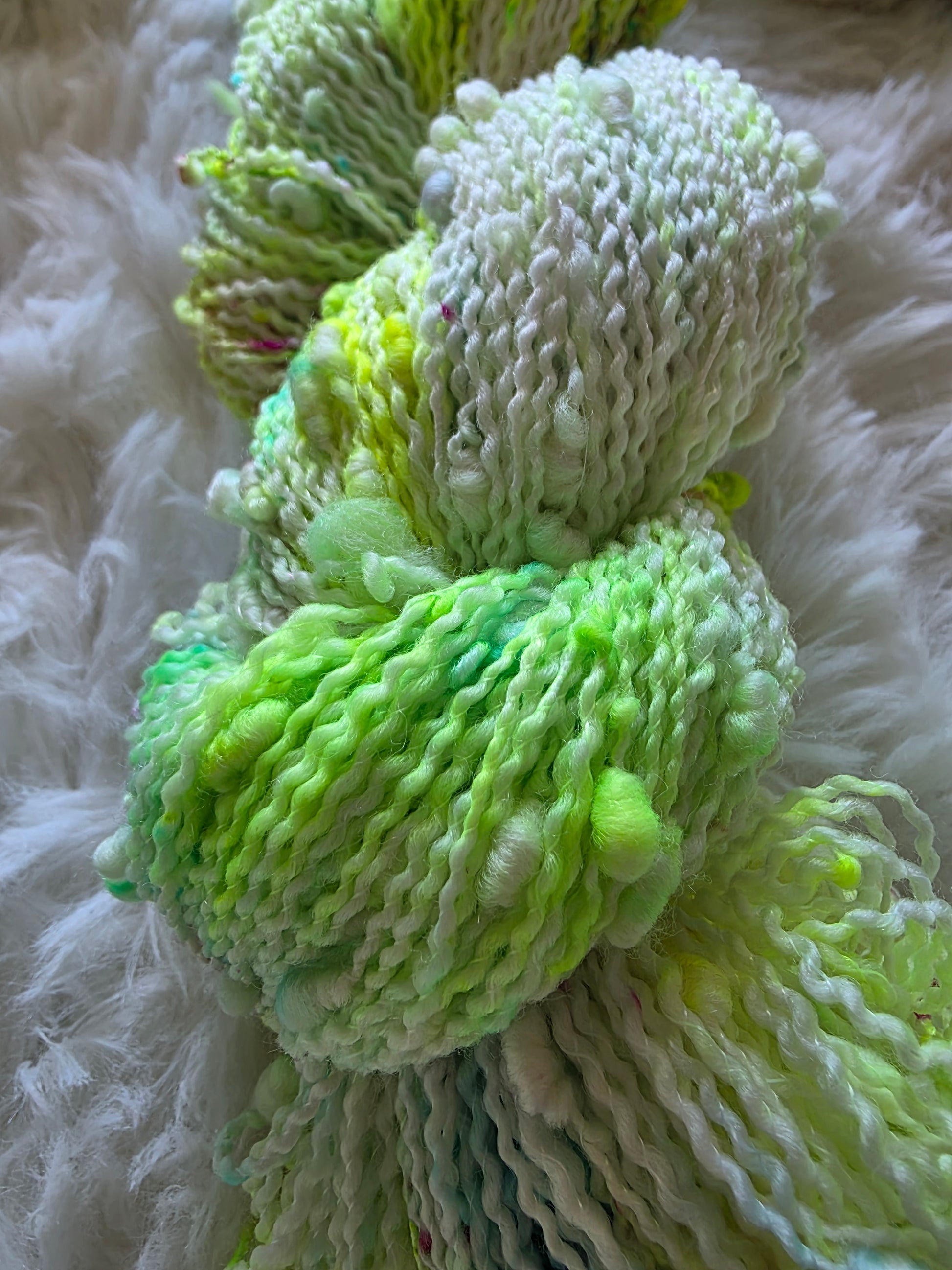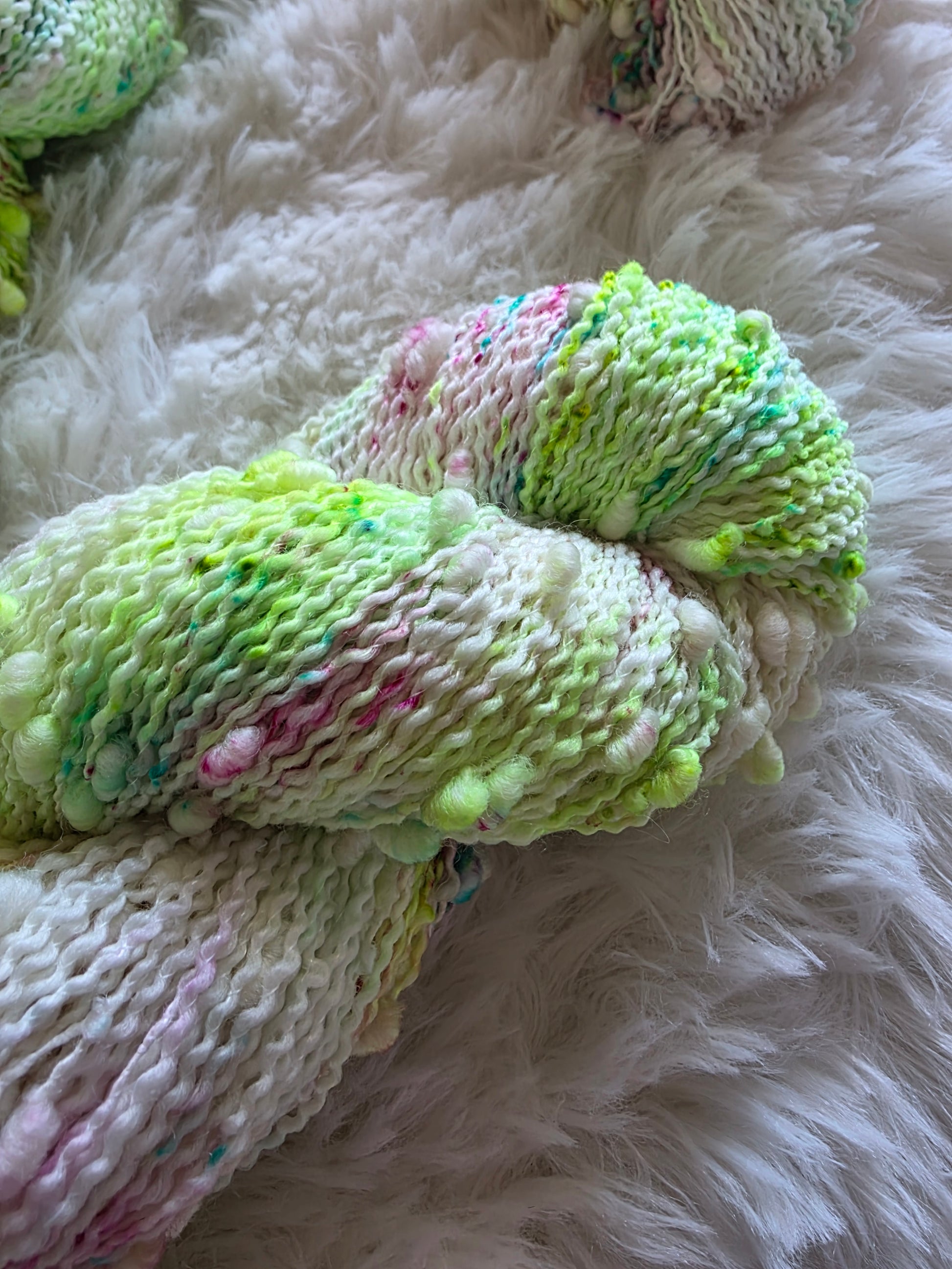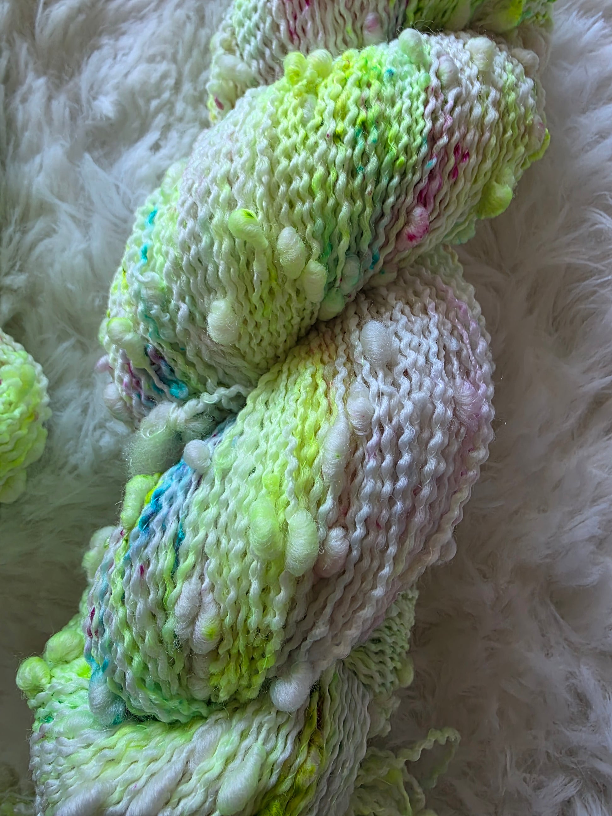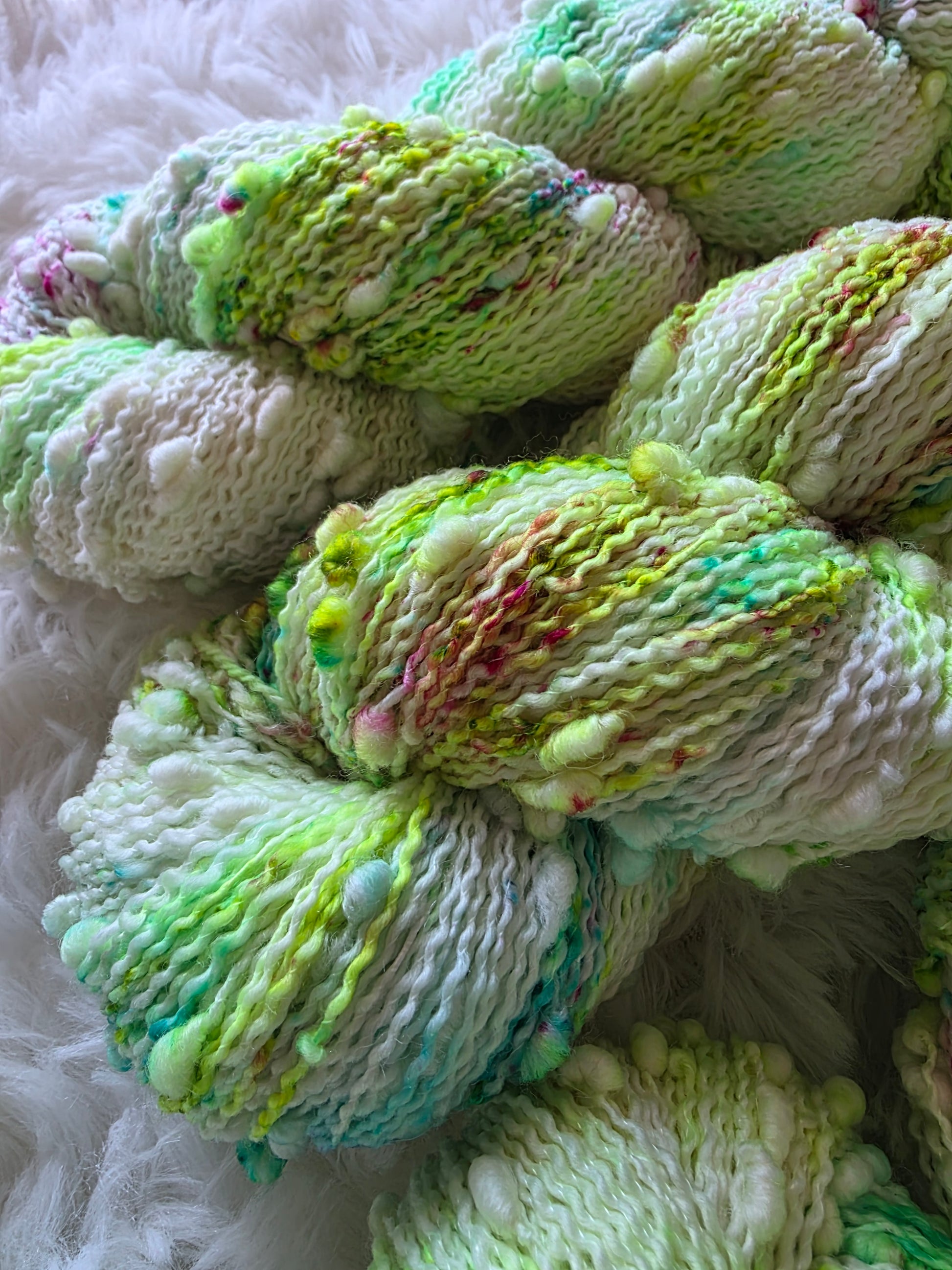 The main skein features various speckles of neon green called Radioactive and speckles of aqua and fuchsia pink.