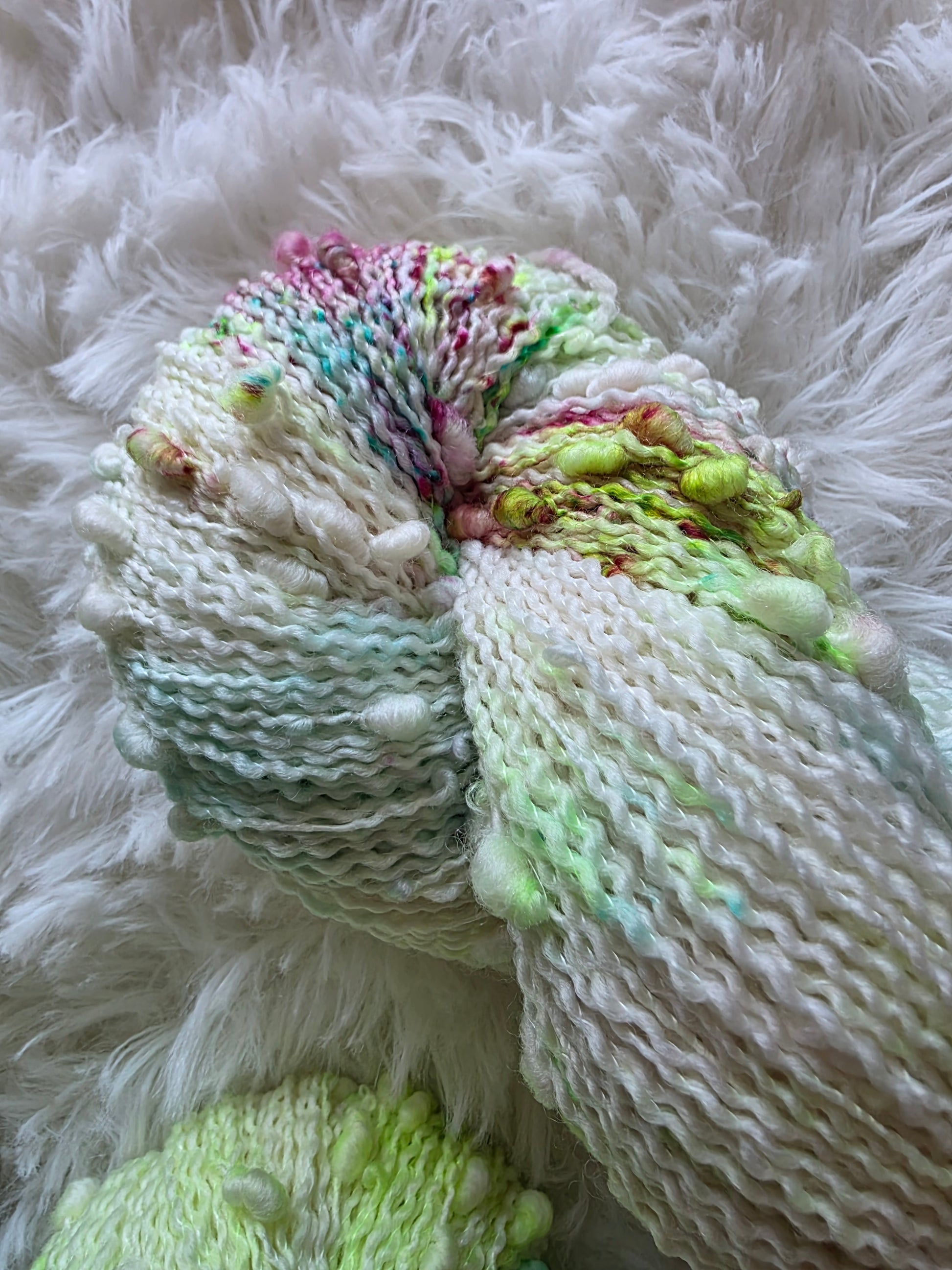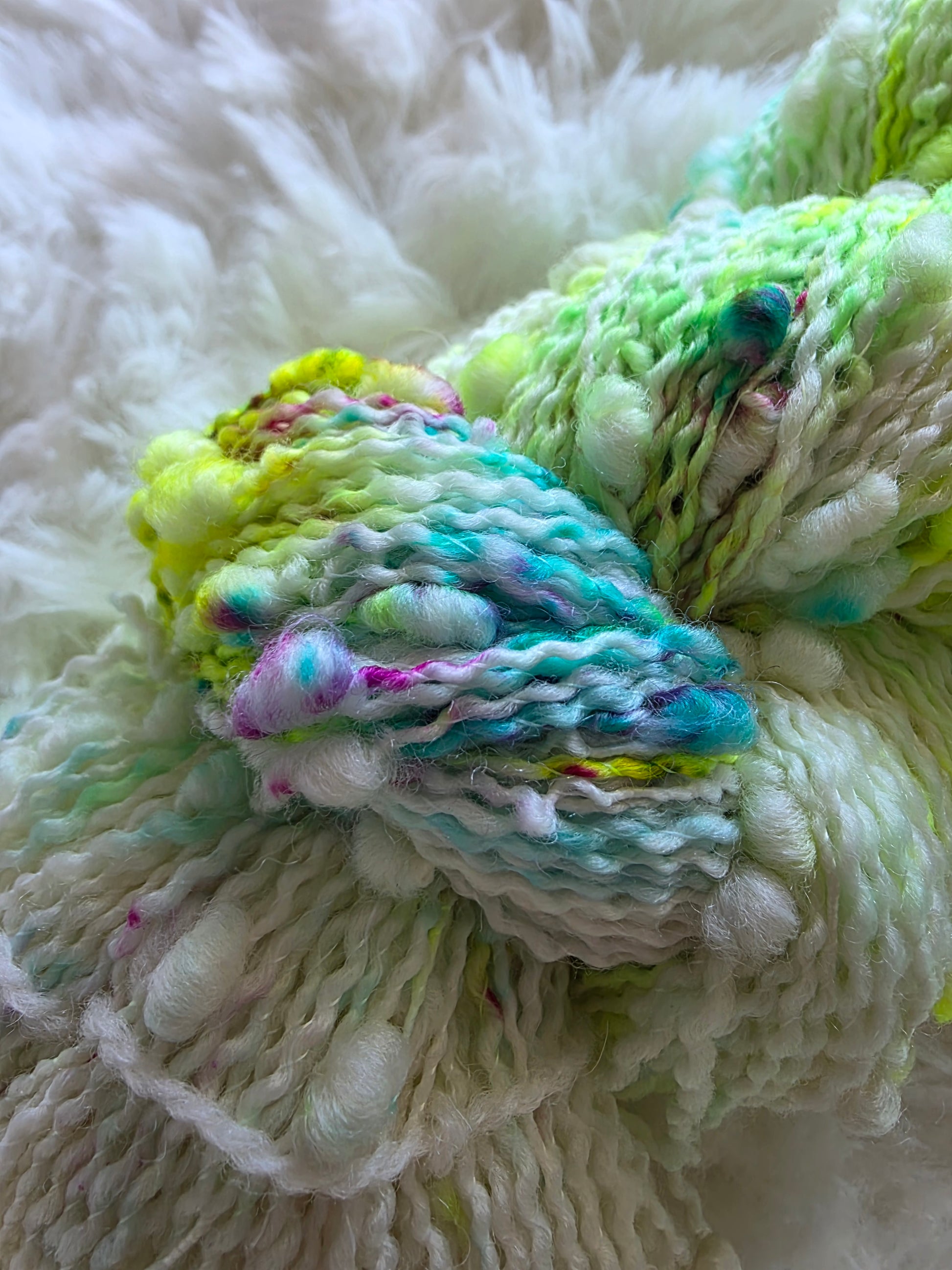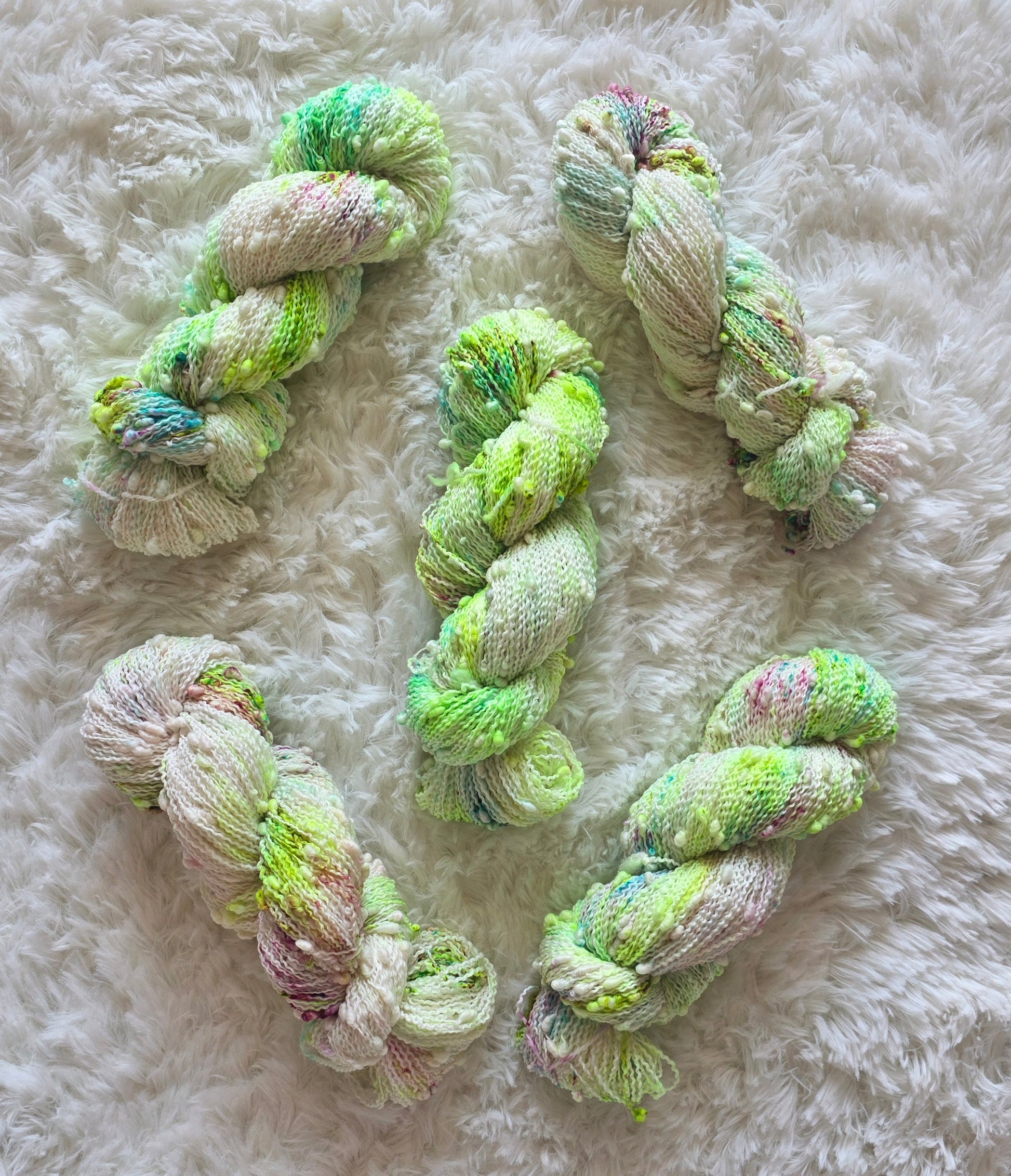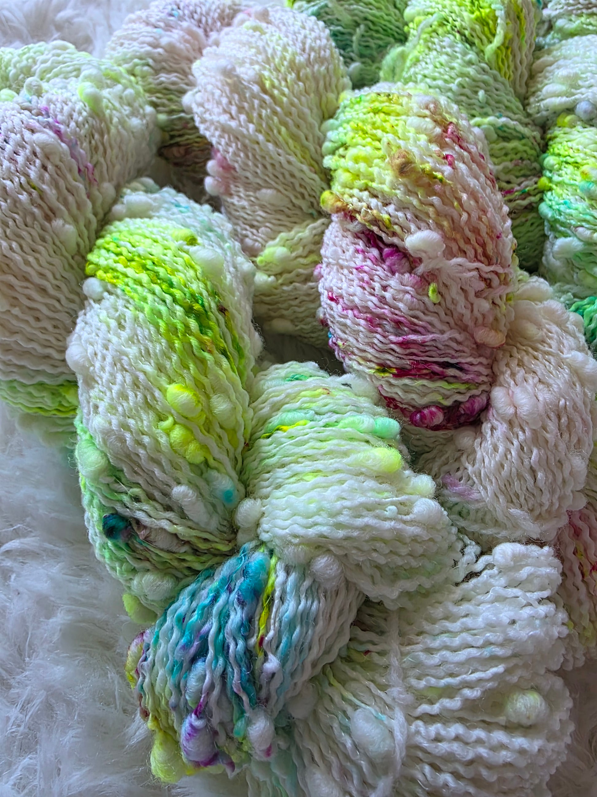 The main skein features various speckles of neon green called Radioactive and speckles of aqua and fuchsia pink.