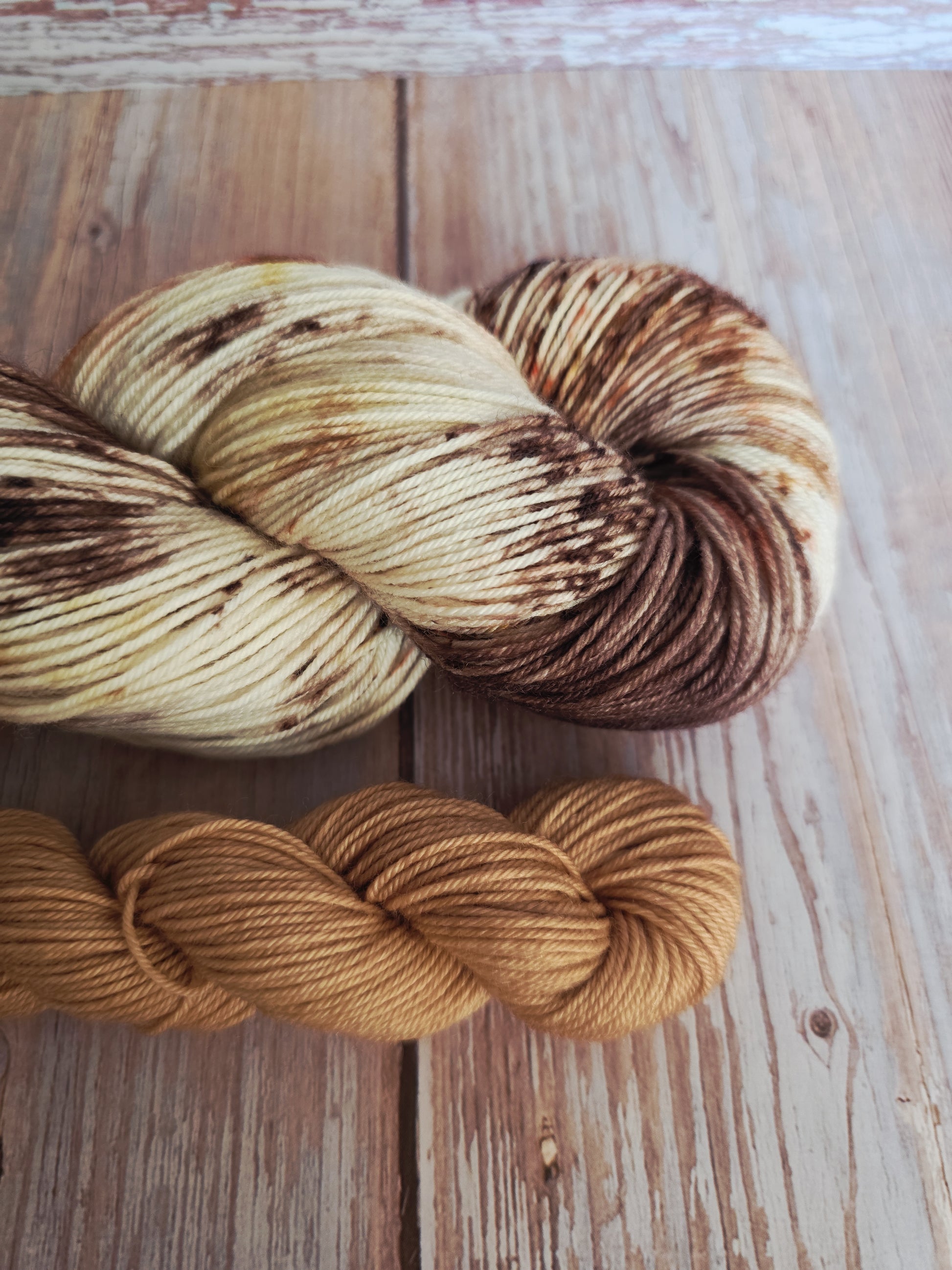 The main skein features lovely specks of various brown tones and dark brown throughout, with a contrast mini skein of warm cinnamon brown, a beautiful combination for your next sock project!