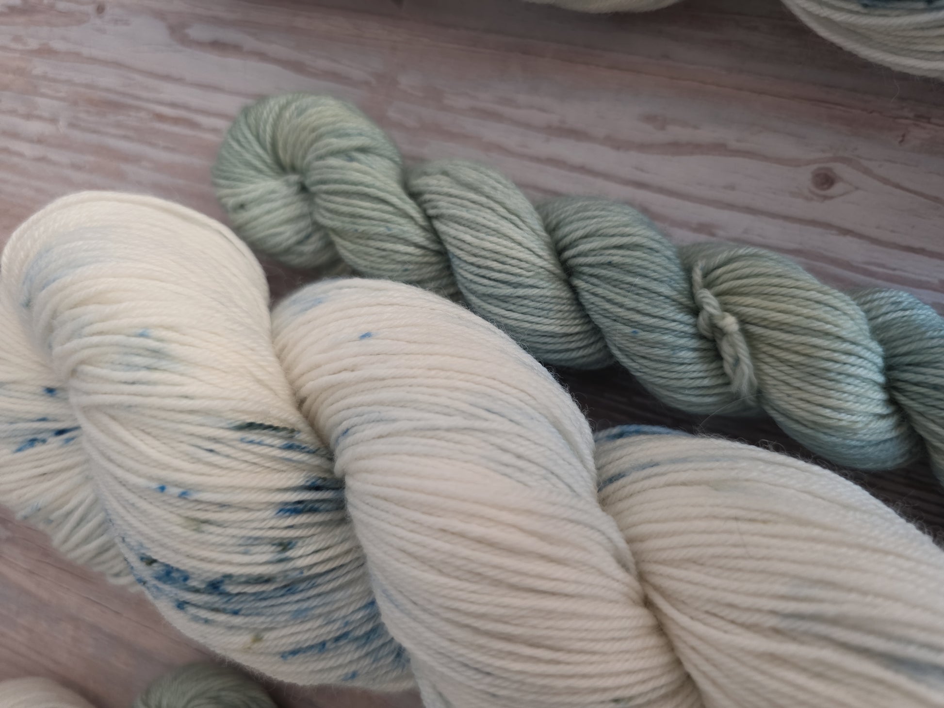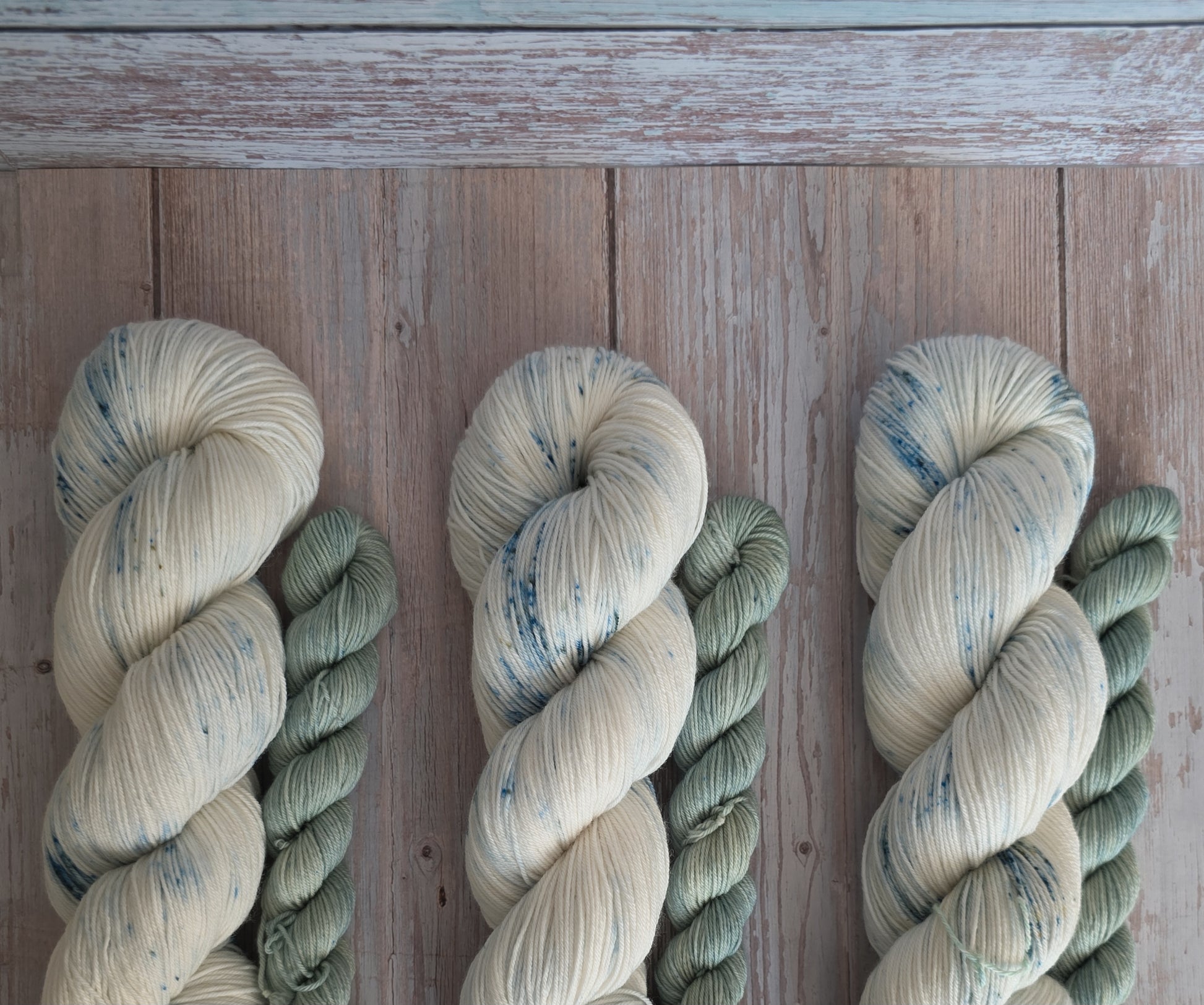 The main skein features lovely specks of blue/green tones with a contrast mini skein of sage green, a beautiful combination for your next sock project!