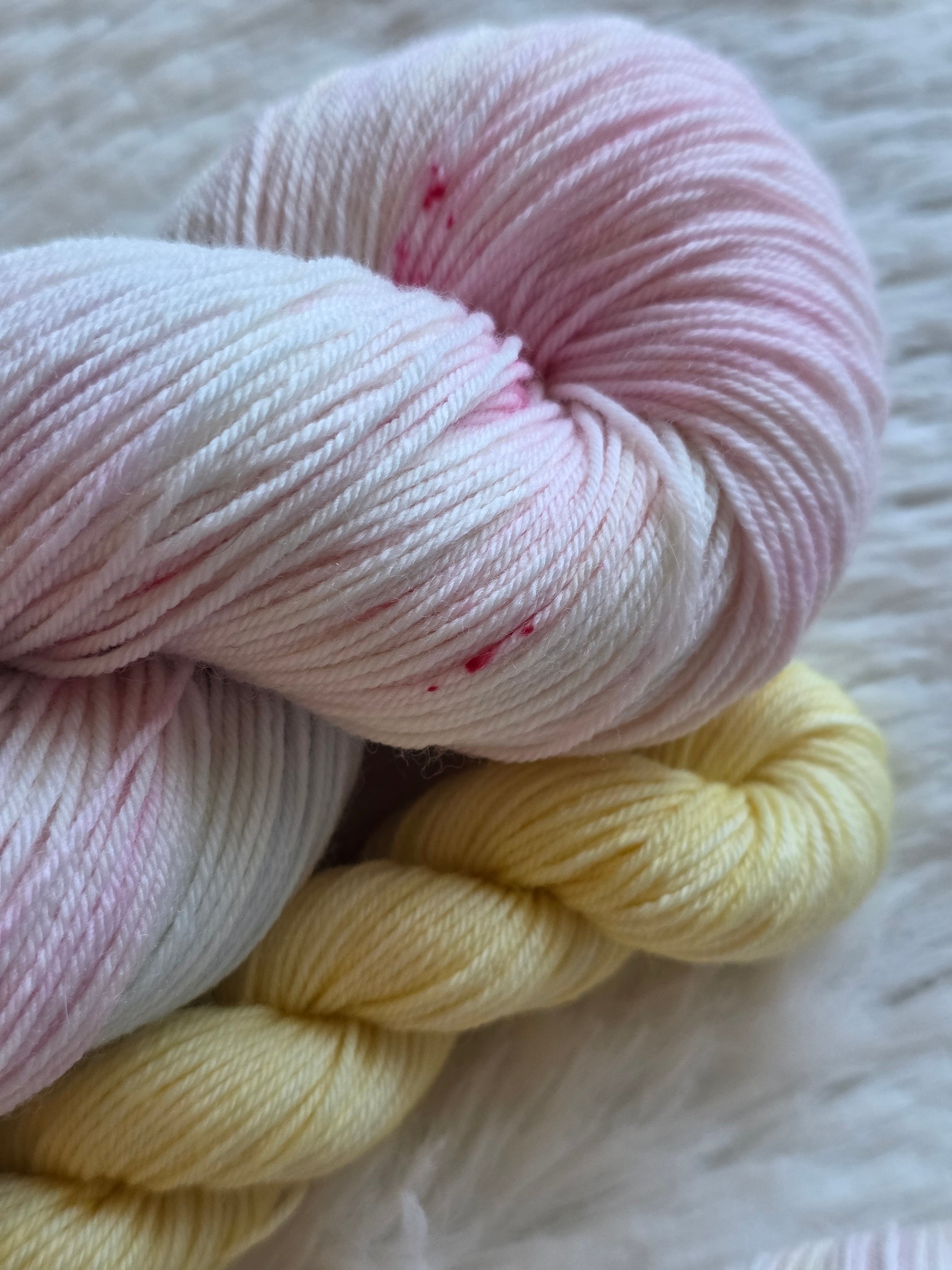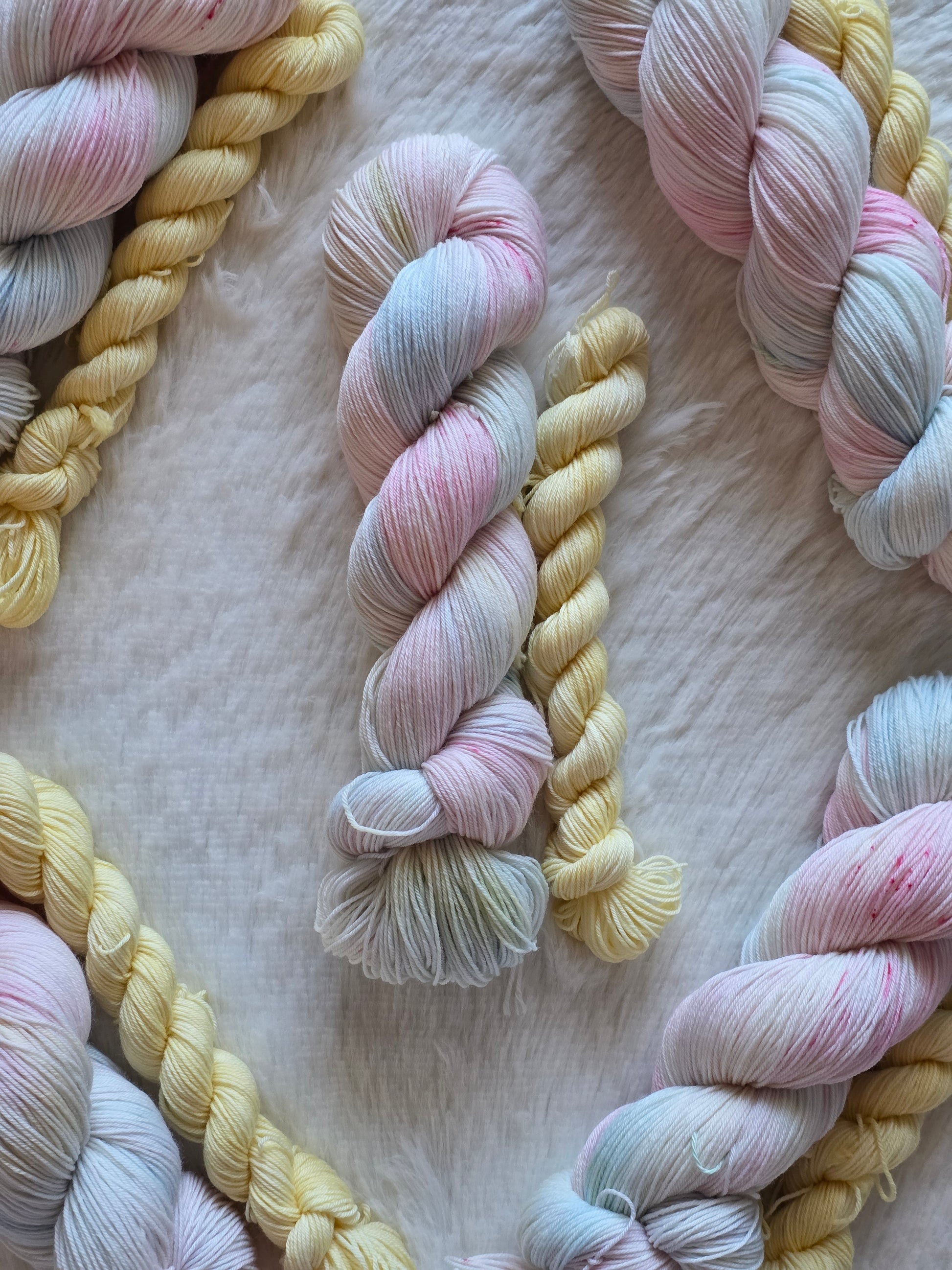 This kit includes one full skein and one coordinating mini skein, hand-dyed on my premium sock yarn base. Perfect for creating beautiful contrast heels, toes, and cuffs that tell the story of Jemima's farmyard adventures.
