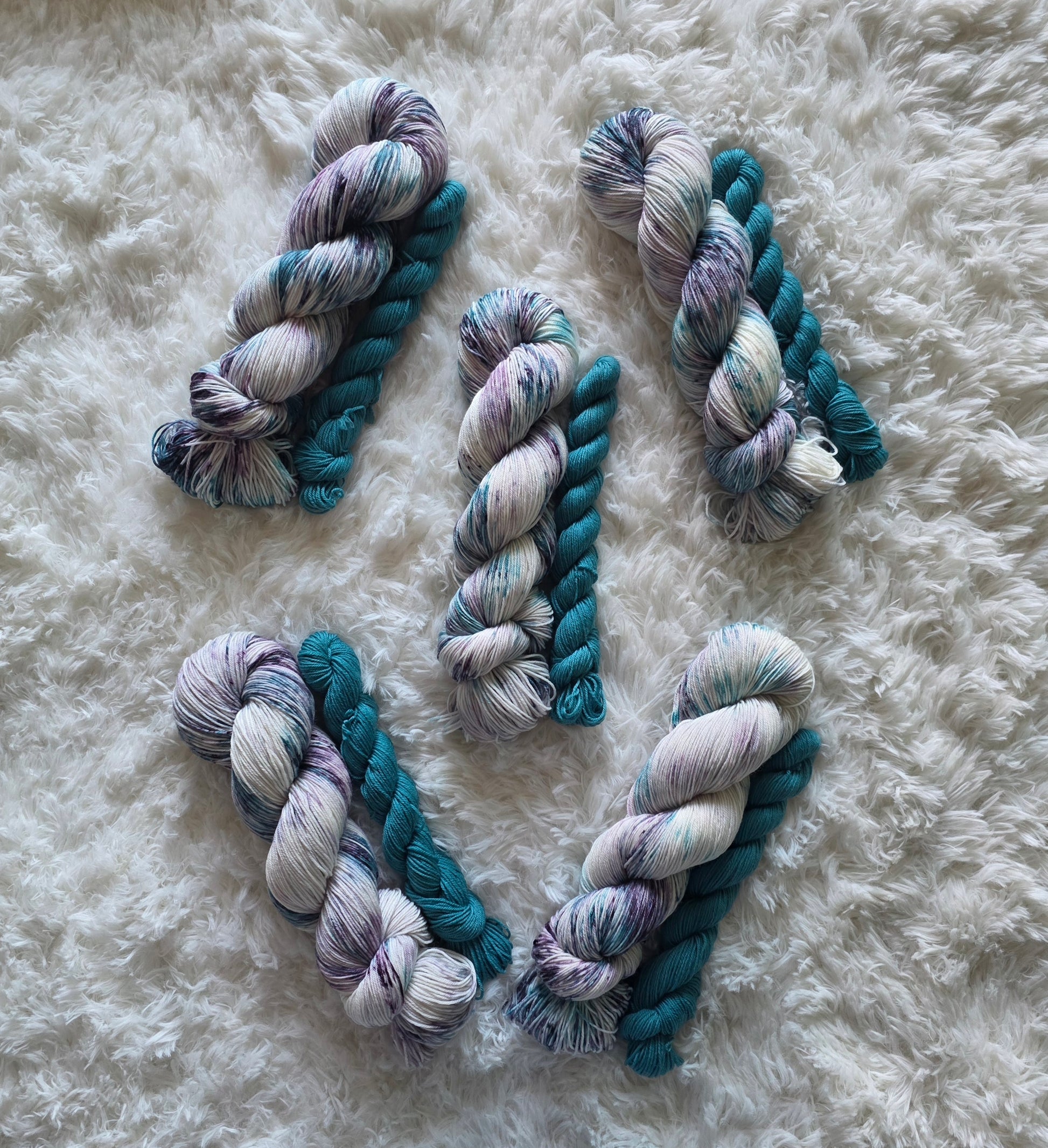 Dive into deep ocean hues with every stitch. This enchanting sock kit captures the mystery of the sea—rich teals, midnight blues, and shimmering aqua tones inspired by mythical waters.